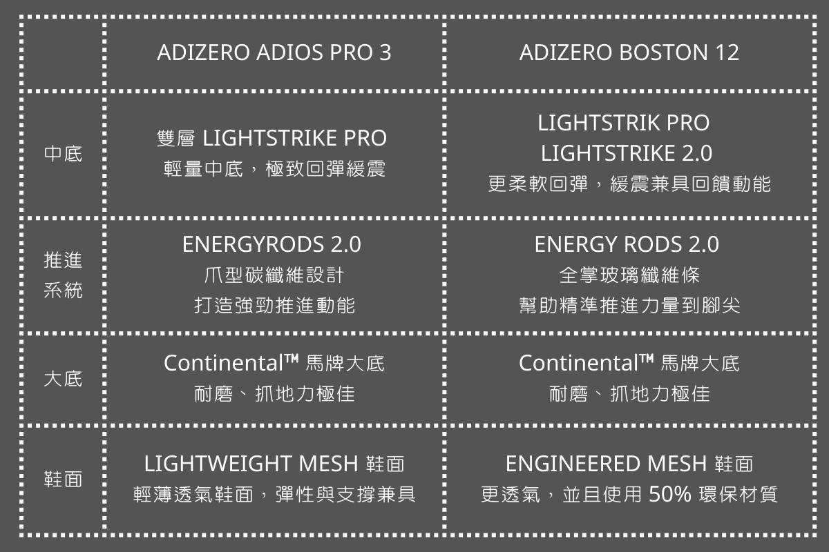 ADIOS PRO 3 及 BOSTON 12 屬於同 一 ADIZERO 系列家族,跑鞋科技與材質相近,並且打破過往訓練鞋和比賽鞋腳感差異過大的刻板印象,讓整體轉換銜接更加流暢。