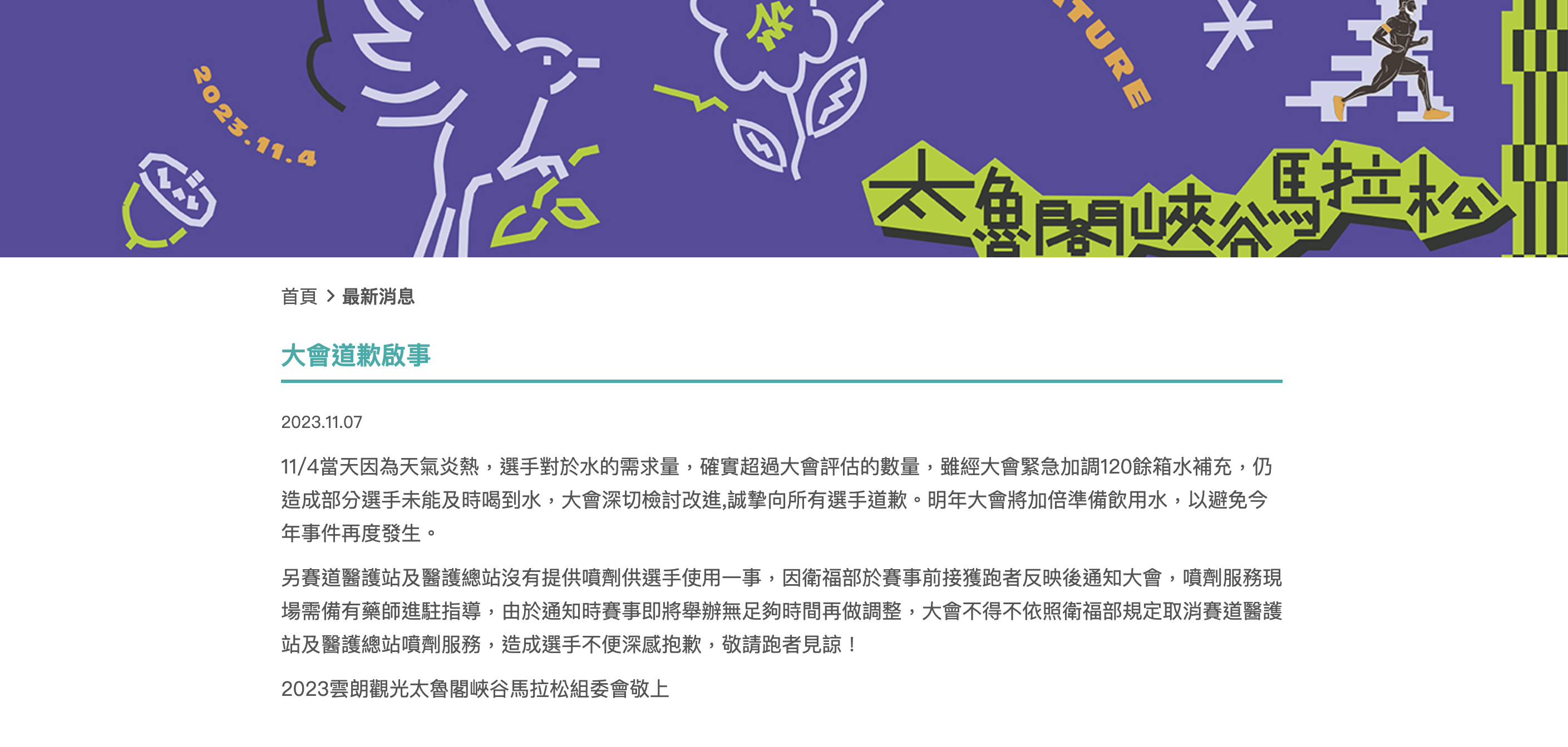 太魯閣馬拉松於官方發布致歉公告。截圖/太魯閣峽谷馬拉松