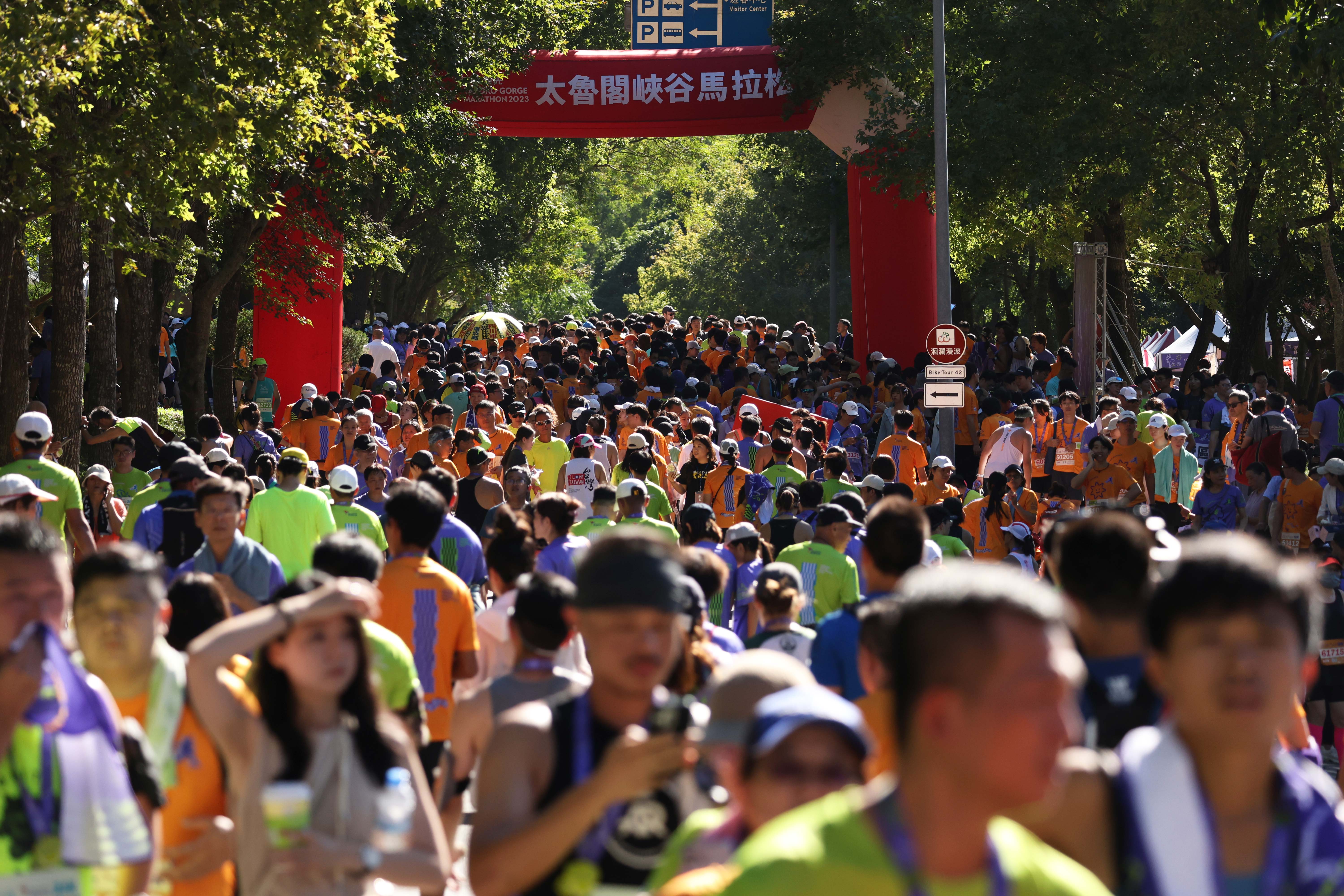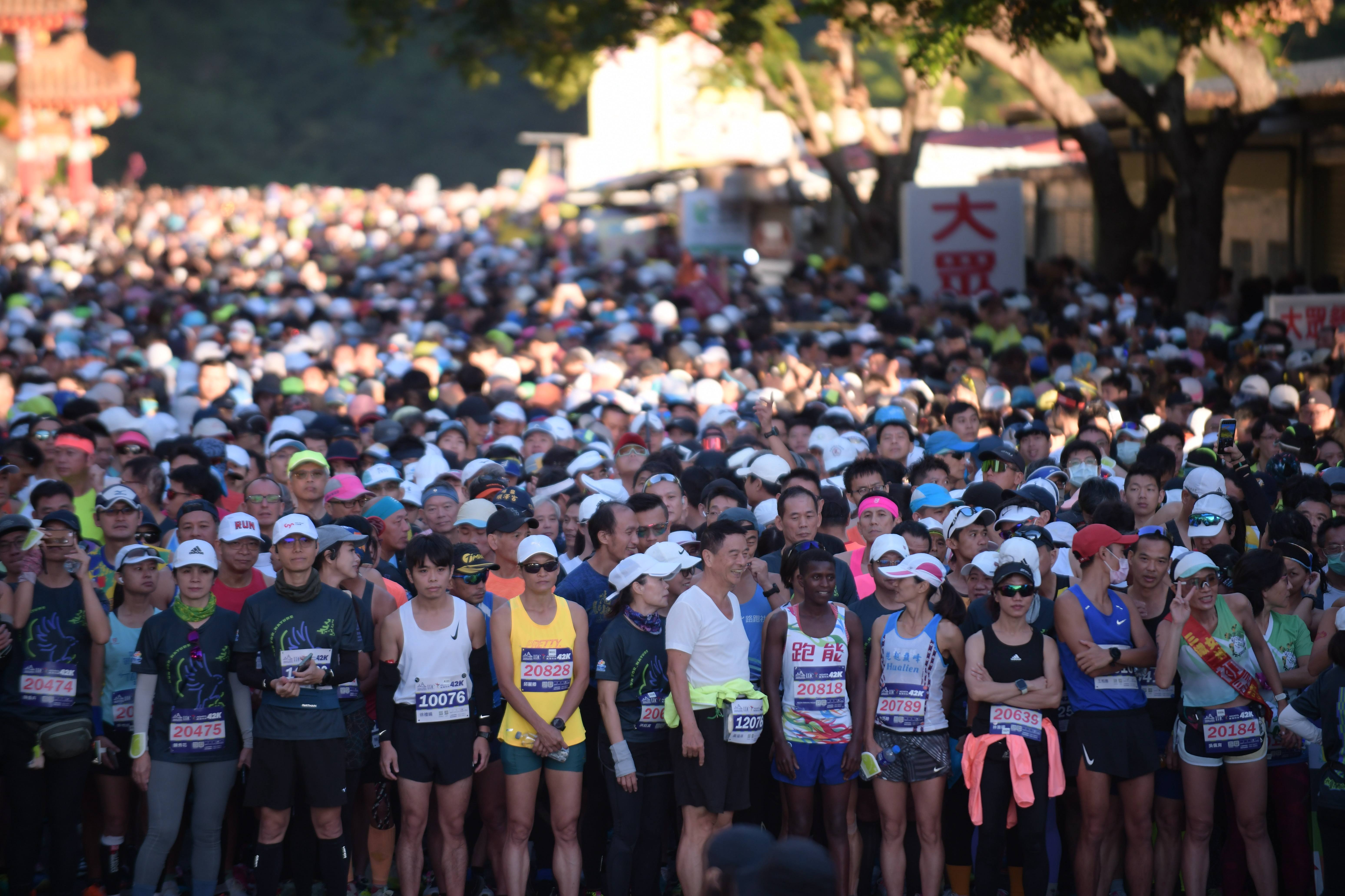 太魯閣馬拉松各組起跑時間過近,導致選手擠成一團。圖/花蓮縣政府提供