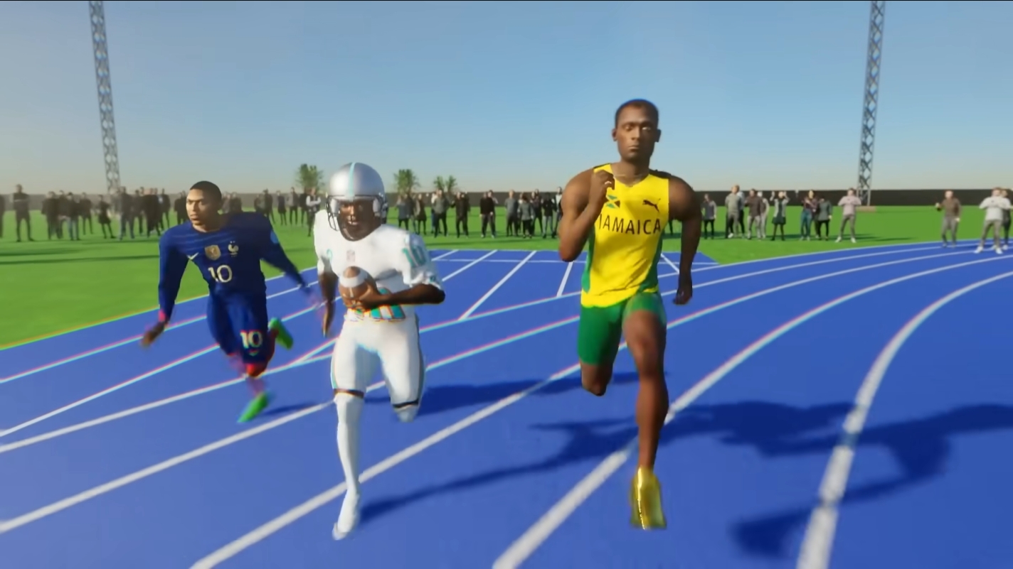 而當 Usain Bol 加入戰局時,畫風瞬間逆轉,只見影片模擬讓 Usain Bol 與兩位選手正面交鋒,毫無疑問的他以強大的能力輾壓對手,甚至在另一項目中,由 Kylian Mbappe 先行起跑其次依序是 Tyreek Hill ,最後才是由 Usain Bolt 起跑的劣勢下,仍能強勢逆轉衝線。