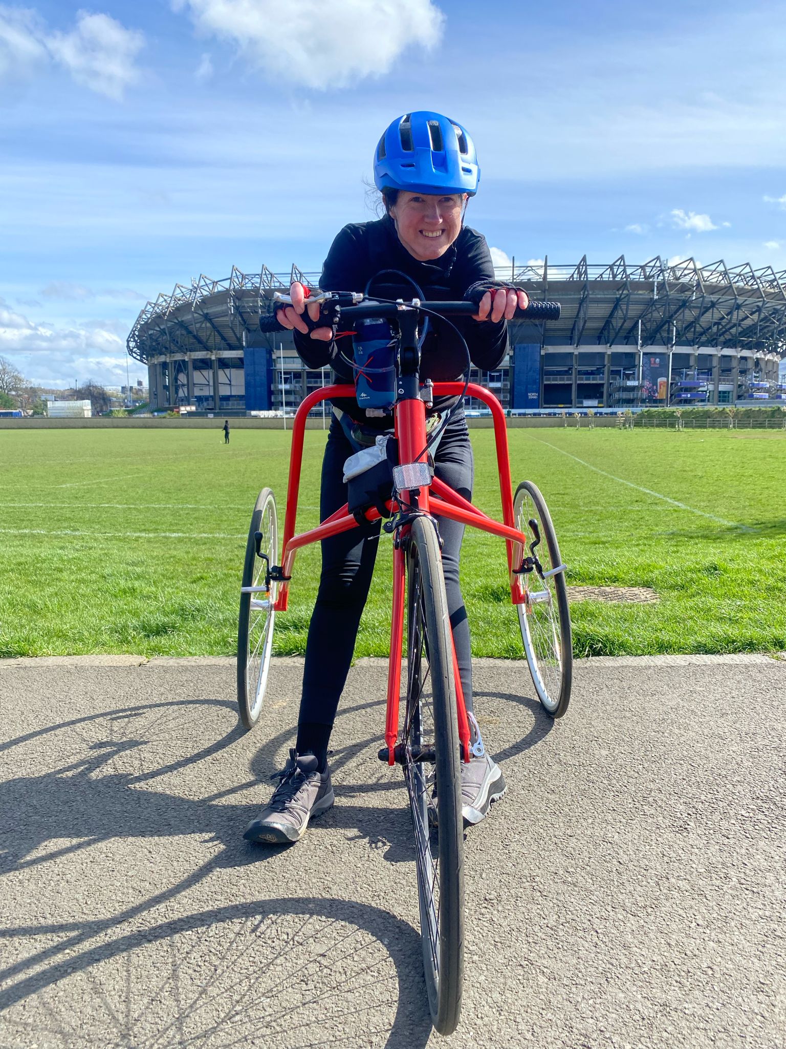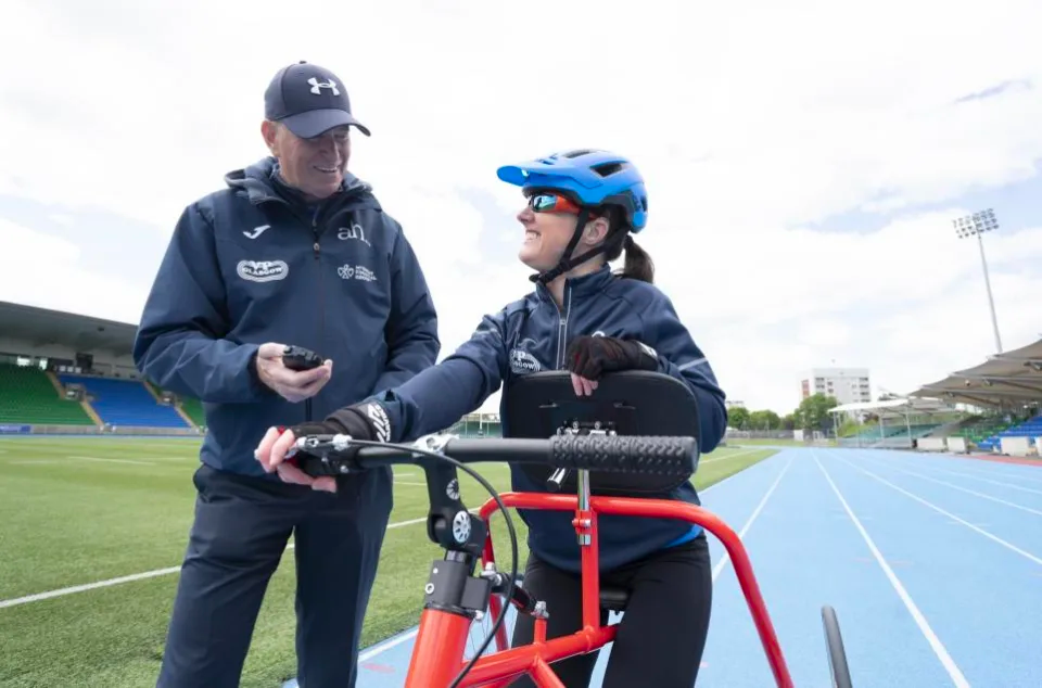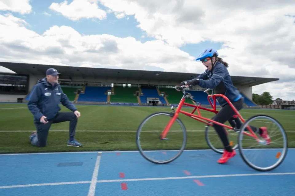 現年 38 歲的 Julie McElroy 博士,來自英國蘇格蘭的最大城市格拉斯哥(Glasgow),在三年前開始接觸競速車 ,開啟了新的生活篇章!這台競速車是一台類似三輪車的裝備,可以藉由坐墊和車身來支撐患者,讓患者可以穩固的用雙腳觸地跑步或走動來產生動力向前移動。熱愛運動的 Julie McElroy 說:「在六年前我受到創傷後,我以為我的生活結束了,只能待在家裡,不能跑步、不能游泳,也不能騎自行車,沒想到這台競速車改變了我的生命,它讓我擺脫了輪椅,增強了腿部力量,重新站起來,能夠再次行走!我開始接觸田徑、10 公里路跑甚至半程馬拉松!」