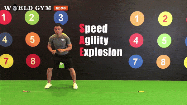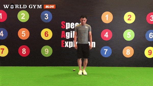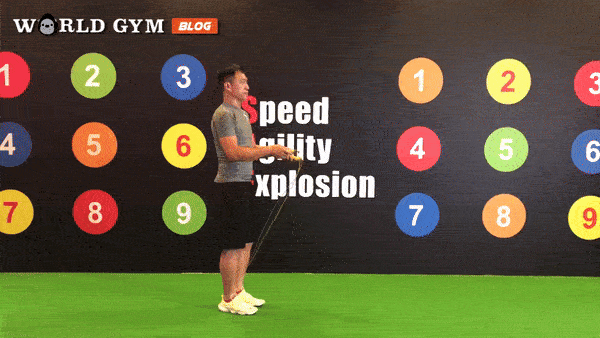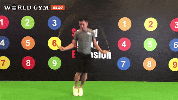 基本跳繩動作,跳起時讓身體往左右移動,重複動作。