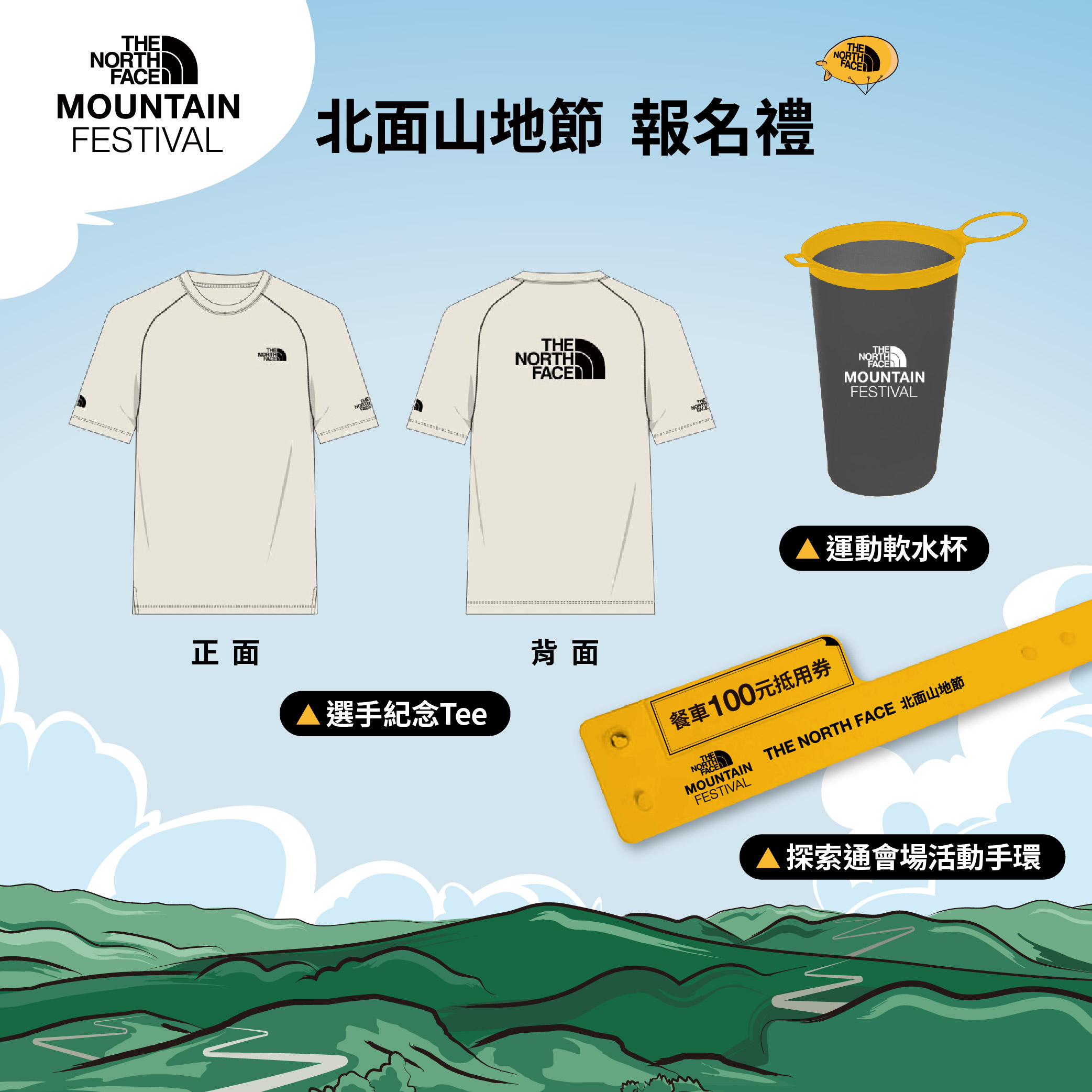 - 參加「 TNF 北面山地節」的人,將獲得:「 TNF 探索通會場活動手環」,戴上它可以盡情體驗豐富多彩的活動,並兌換美味餐點!