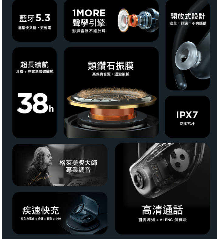 - 1MORE S50:具備長達38小時的單次充電續航能力,適合長時間運動,並且具備IPX7防水等級,能承受大量汗水和戶外使用環境。