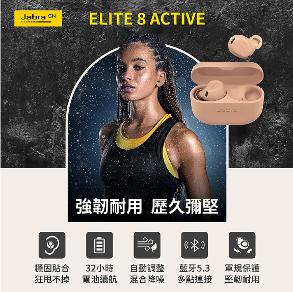 - Jabra Elite 8 Active:具備 IP68 防塵防水等級,並且通過了美國軍規測試,耐用性極強,適合各種運動環境,防水防汗效果極佳。