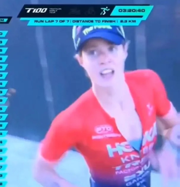進入跑步賽程後,追擊者們全力以赴,領先差距在賽程過半時縮小至略高於一分鐘。然而,杜拜的酷熱與極限的身體消耗逐漸成為致命因素,最具威脅的選手體力不支,被迫放慢速度甚至步行,這為 Knibb 鞏固勝利創造了機會。最終,她以無可挑戰的姿態再添一座 T100 冠軍獎杯。