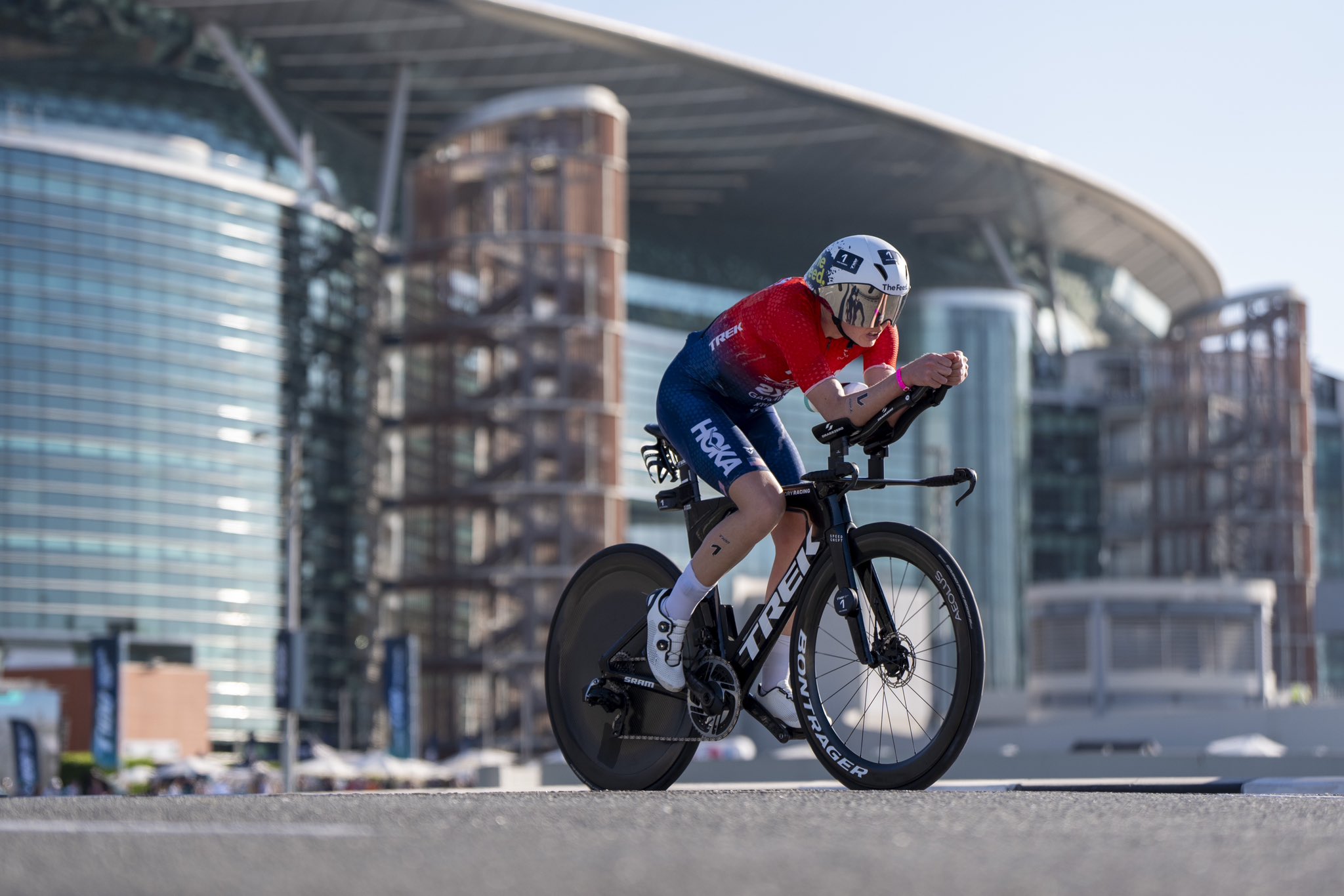 進入 80 公里的自行車賽段,場上的焦點不言而喻:如何追上或至少跟住 Knibb。杜拜賽道的技術性設計一度讓 Knibb 的進攻受到限制...