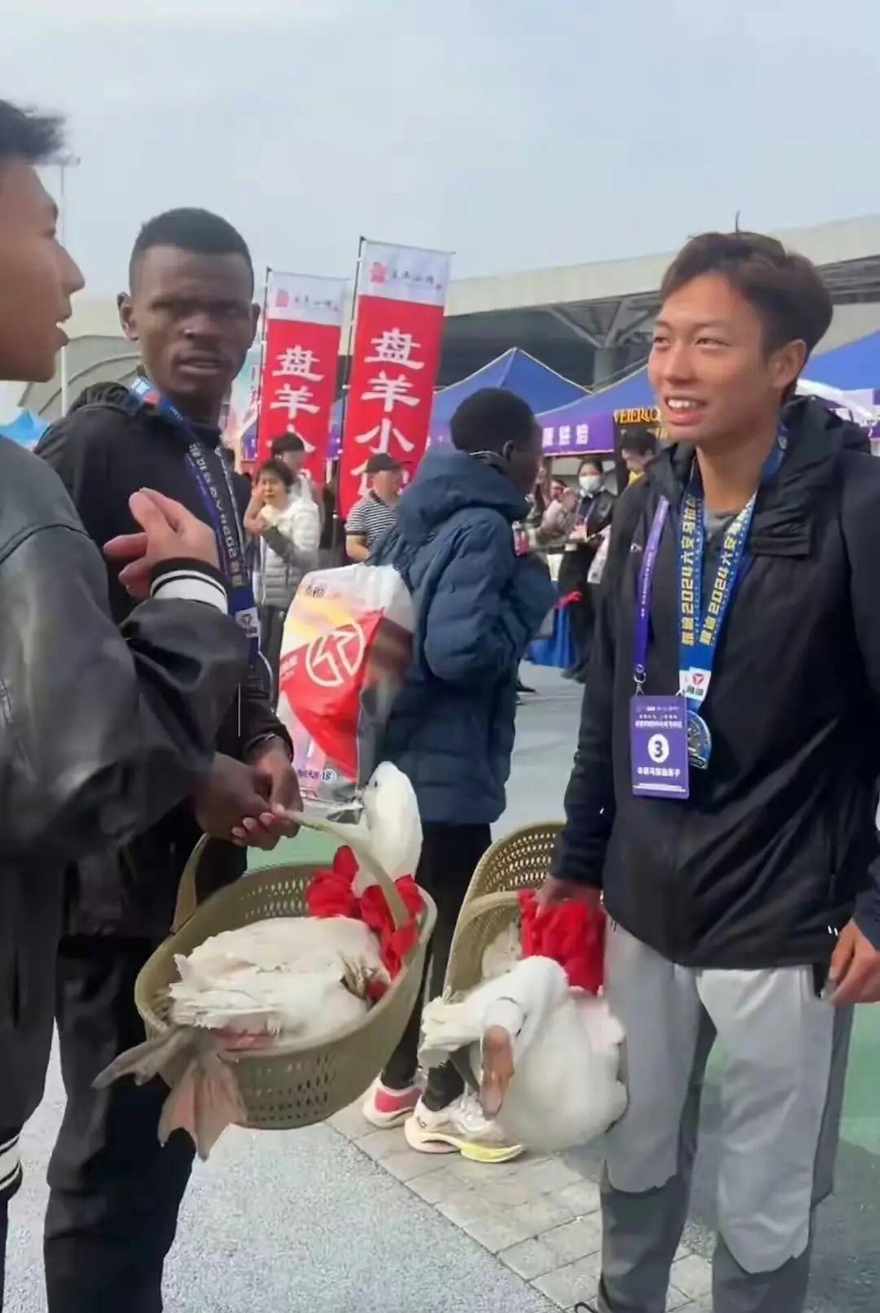 一名女選手因當日比賽表現亮眼,成功抱走一隻活生生的鵝。但她不方便帶走,於是當場以 50 元人民幣(約新台幣 200 元)的價格賣給當地人。現場甚至出現「活鵝交易潮」,據說非洲選手也靠翻譯賣出。