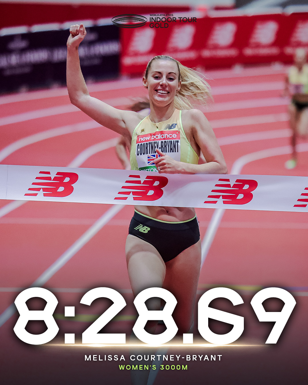 英國長跑名將 Melissa Courtney-Bryant 在波士頓世界田徑室內巡迴賽上演強勢一戰,跑出本年度全球最快的 3000 公尺成績,以 8 分 28.69 秒奪冠,刷新個人最佳紀錄!