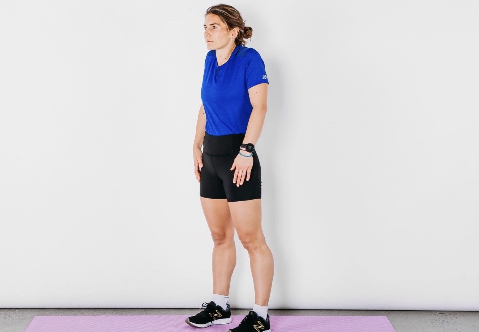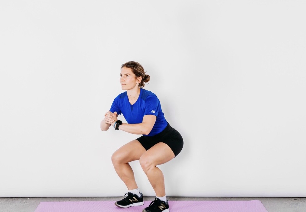 ![]() | 站姿,雙腳略比臀寬,腳尖稍微朝外,雙手合十於胸前保持平衡。臀部向後坐,慢慢彎曲膝蓋下蹲,保持胸部挺直,直到大腿至少與地面平行。用腳跟發力站起回到起始位置。 | 腳踝靈活度對跑者來說至關重要,而完整的深蹲能夠提升腳踝活動範圍。 |