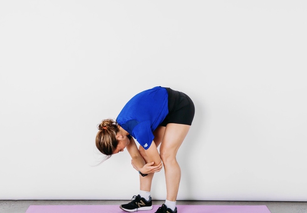 ![]() | 站姿,雙腳與肩同寬,雙手自然垂放。稍微彎曲膝蓋,慢慢向前彎腰,讓頭部向地面垂落,雙臂彎曲抱住相對應的手肘。停留片刻,然後緩緩回到站姿。 | 這個動作一次性伸展手臂、放鬆大腿後側肌群,並幫助打開上背部,同時提升脊椎的靈活度 | ||