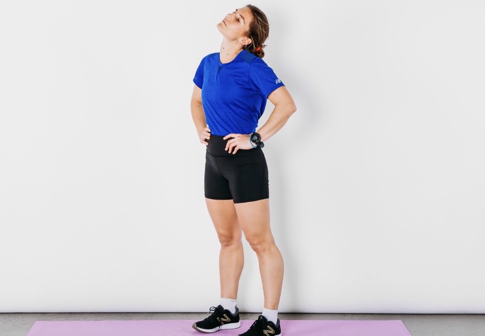 ![]() | 站姿,雙腳與肩同寬,雙手自然垂放。慢慢舉起雙臂向上,最後雙手交握,收緊臀部,讓上半身微微向後彎曲。 | 它有助於減少肩頸僵硬,讓你在跑步時能夠保持開放的胸腔,順暢呼吸。 | ||