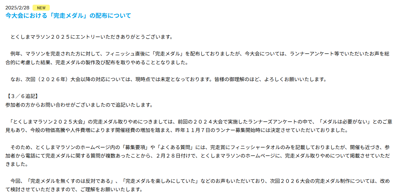 德島馬拉松官方表示,2024年比賽後的調查顯示,有部分跑者認為獎牌不是必需品,考量到物價上漲、人力成本增加等因素,2025年起不再提供完賽獎牌,並在去年11月7日開放報名時,已明確公告完賽禮品僅包含「完賽毛巾」。然而,隨著比賽日臨近,仍有不少跑者致電詢問完賽獎牌的相關事宜,因此官方再次強調這項政策。