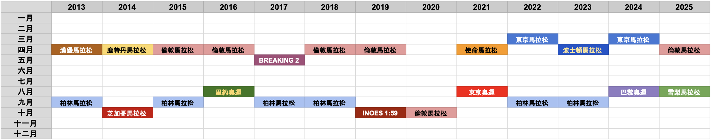 📍Kipchoge 自 2013 參加馬拉松賽事一覽: