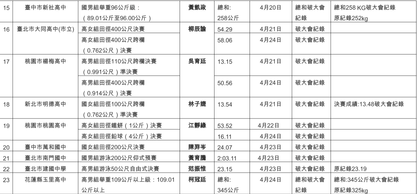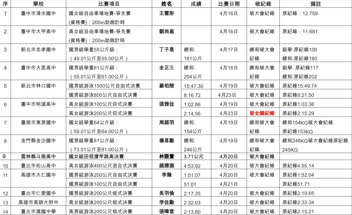 ▪︎ 114 年度全中運破大會紀錄且符合『王楊嬌體育賽事創紀錄獎』的選手名單: