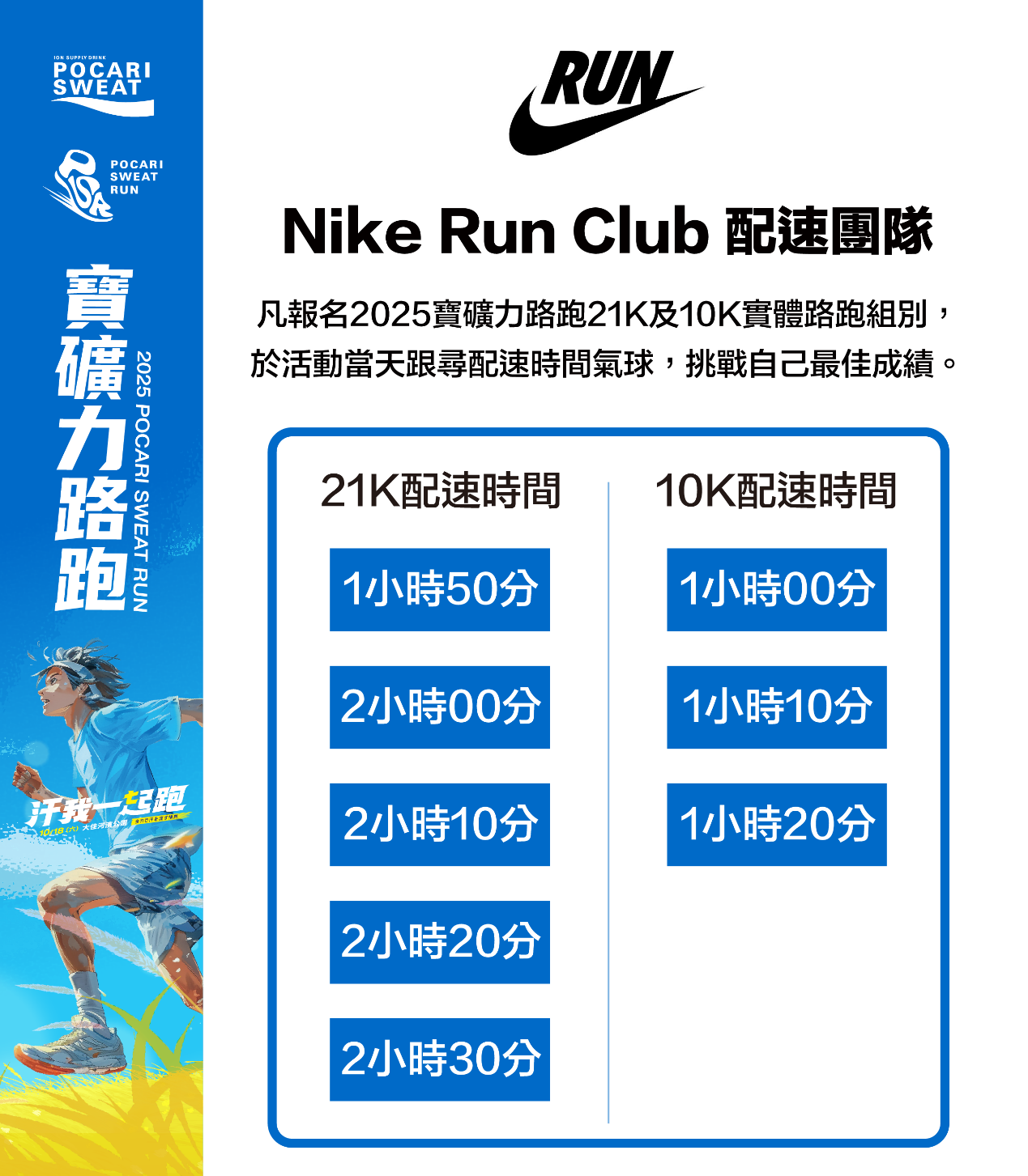NRC 配速團隊分別為 21K 組與 10K 組配速,讓跑者能依照自己適合的配速安心完賽。(圖片來源|寶礦力水得)