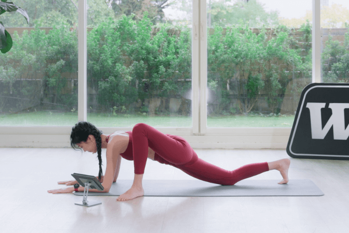 - 雙手撐起身體,將前腳踩在雙手外側,膝蓋彎曲約 90 度,後腿往後伸直放鬆。