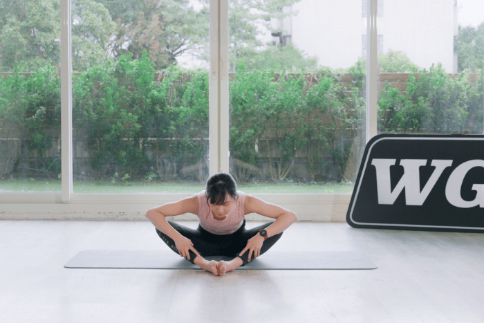 - 坐在地板上,將雙腳腳掌相對、膝蓋自然向兩側打開。雙手握住腳踝或腳背,讓身體微微向前傾,維持背部平直。