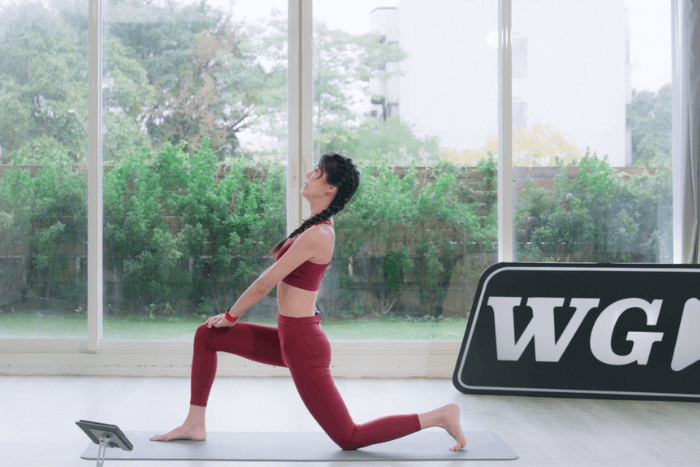 - 一腳往前彎曲成弓步,後腳伸直踩穩,拉伸髂腰肌,雙手往上延伸。