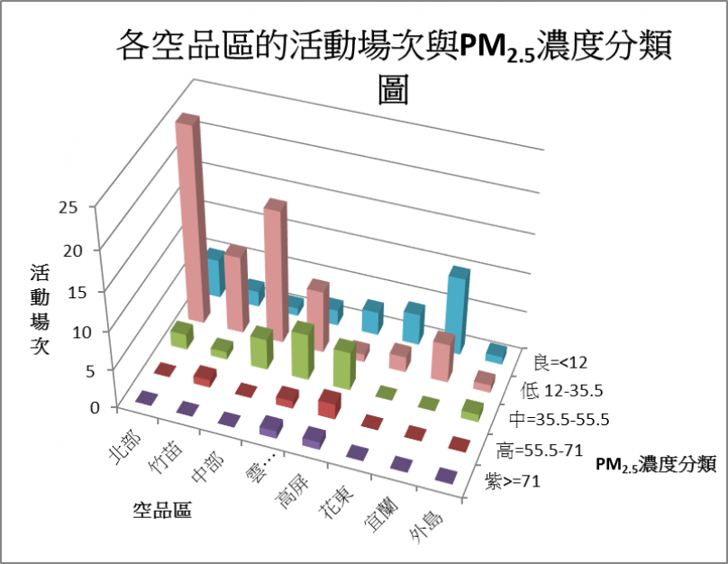 高程度的場次聚集在竹苗、雲嘉南和高屏等三個空品區。全年紫爆的2場次,分別位於雲嘉南和高屏地區。2014年1月雲嘉南空品區出現PM2.5濃度最高的路跑賽事(83.1μg/m3),其次為高屏空品區分別在1月和12月出現PM2.5濃度為63.10μg/m3及64.29μg/m3的全馬路跑。