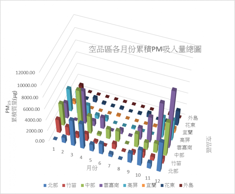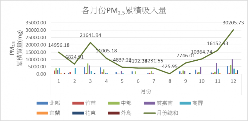 圖五:各空品區、各月份PM2.5累積吸入量。