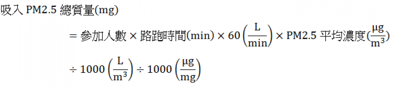 根據方法3所設計的公式,假設每場全馬路跑的參加人數等同限制人數,而路跑時間等同時限,以每人平均潮氣容積為60 L/min,則一場全馬路跑所吸入的PM2.5總質量(mg)為: