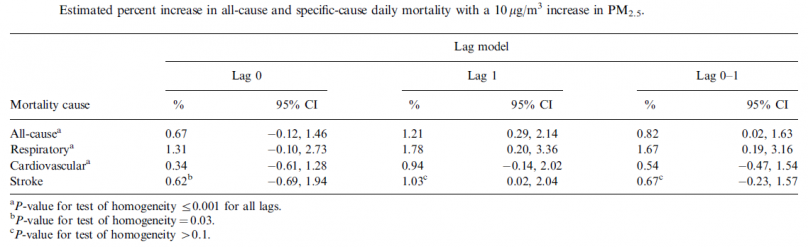 PM2.5亦有短期健康效應。根據一項大規模研究顯示2,當PM2.5的濃度每上升10μg/m3,在隔天就會增加全死因、呼吸道疾病死因、與腦中風死因的風險。