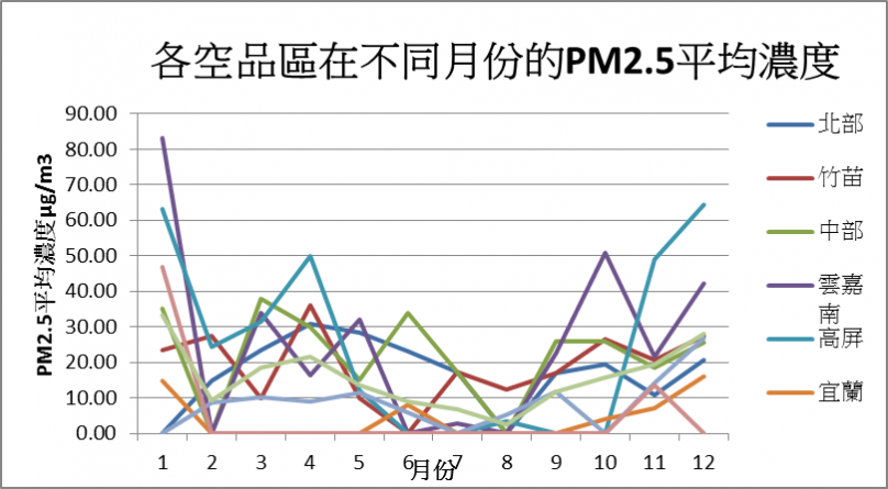 為探討台灣各空品區適合舉辦路跑的月份,根據環保署的資料,製作成圖三。由圖可知台灣西部各區皆有類似的趨勢:夏天比較低,秋天以後逐漸升高。尤其一月時雲嘉南出現最高值,其次為一月及十二月的北部地區。