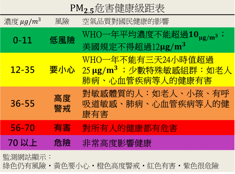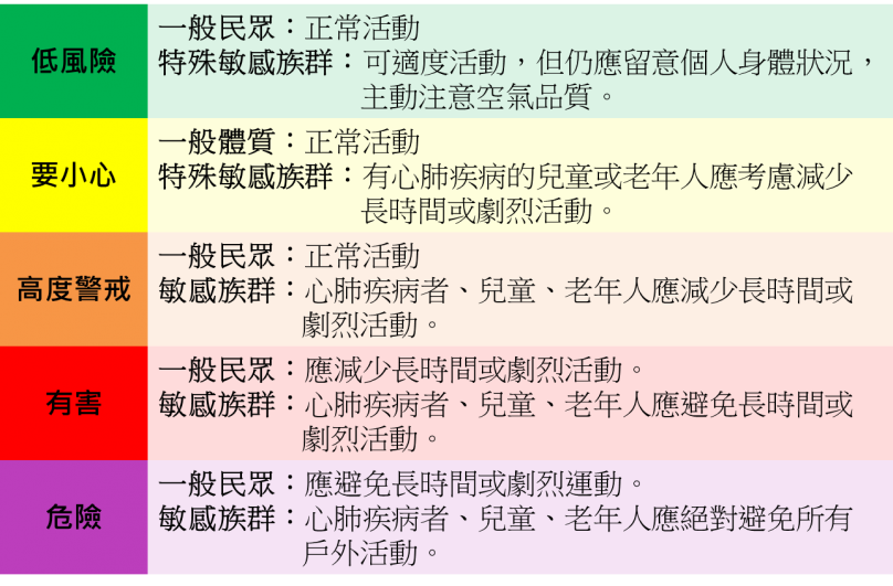 根據過去研究結果,我們將PM2.5的濃度(μg/m3)作以下分類:良(≤12),低(12<PM<35.5),中(35.5≤PM<55.5),高(55.5≤PM<71),紫(PM>70)。