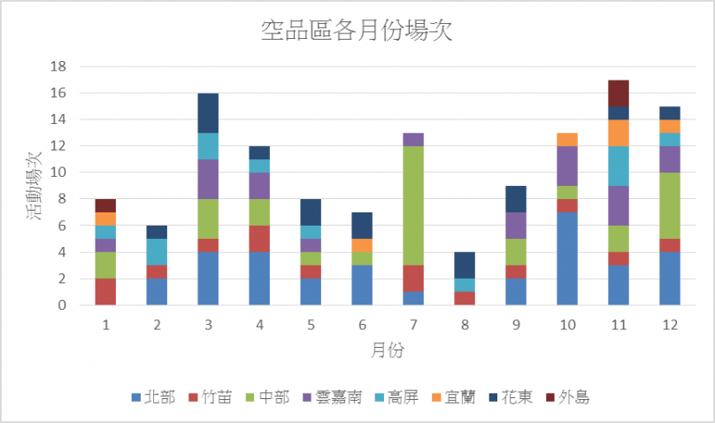 雖然北部空品區內路跑賽事最多,但因為PM2.5月平均濃度相對低,而使得累積吸入量較低。花東及外島地區因為場次少,且PM2.5平均濃度又低,參加這些賽事的路跑者吸入PM2.5的量相對低許多。