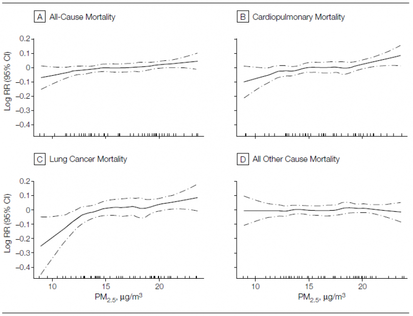 PM2.5有長期健康危害效應,已經被國際癌症研究署(IARC)認定為第一級致癌物。根據過去的研究1,長期暴露於PM2.5,會增加肺腺癌與心血管疾病的風險。且由下圖可知,當PM2.5濃度在12μg/m3以下,PM2.5造成肺癌之劑量與反應之間仍存在著直線關係: