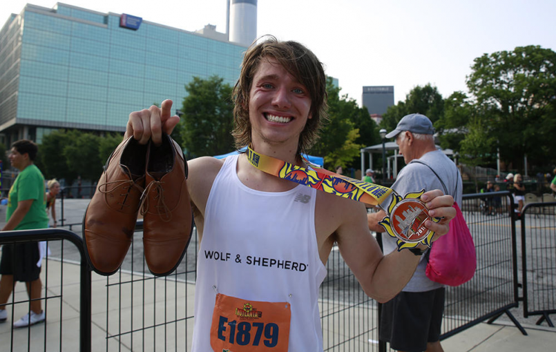 穿西裝跑步不稀奇,穿皮鞋跑不可就不常見了。一位來自雪城大學的研究生 Juris Silenieks 以 77 分贏得 6/12 舉辦的 Hotlanta 半程馬拉松冠軍,他腳上穿的可不是什麼名牌跑鞋,而是一雙正統的皮鞋!