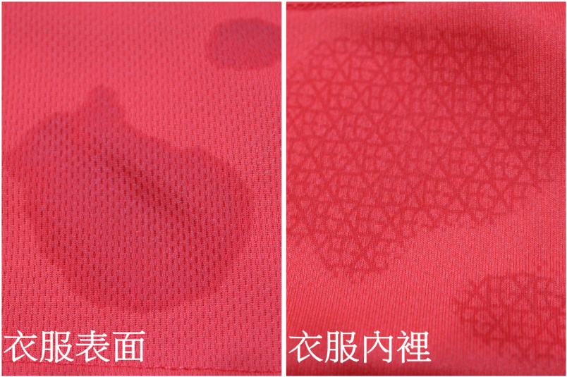 首先,將水滴在衣服內裡,可以明顯見到透過單向導濕技術,內裡吸收水份並產生「導軌」,即圖中明顯的紋路,這些導軌將水份單向排至衣服表面,搭配透氣孔洞的設計,吸濕排汗相輔相成!