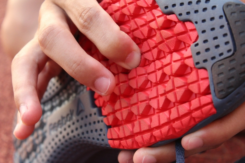 接著,前腳掌鞋底的區塊相當特別,它是 Reebok 強調的關鍵區域。能見到該區域佈滿 Reebok 獨家的彈性溝槽設計,加強鞋底的柔軟度,幫助跑者步態轉換更流暢,並大膽使用鮮明的紅色,正宣告著這是跑者足部受力最多的位置。當然,這一切要歸功於大數據的足測資料分析,使得 3D 列印技術所打造出的大底更臻完美。