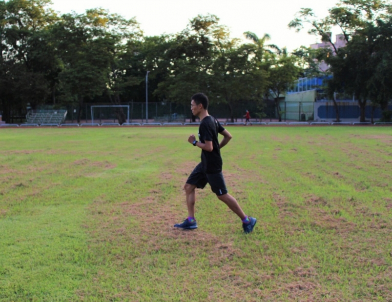來到操場內的草皮,試著跑數趟輕快跑。在看似平坦的大草皮奔跑,其實每一步都有可能踩到坑洞,在這實為顛簸的草皮,ZPRINT 3D 再次發揮了它動態穩定性的功能。記得在某趟輕快跑拌到形狀特異的石頭,當下心裡有些驚嚇,不過 ZPRINT 3D 的避震效果與側向支撐迅速將我的注意力拉回前方的輕快跑目標終點處。