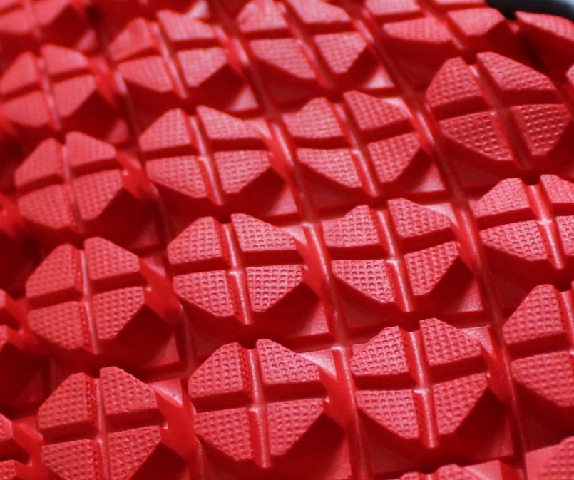 彈性溝槽並非一塊硬生生的膠底,而是由許多獨立的避震顆粒所組成,如此設計帶給跑者超高的靈活度。每粒顆粒都有它專屬的切面角度與走向,有些顆粒側凹的程度較深,有些則較為突出,真的十分有趣。