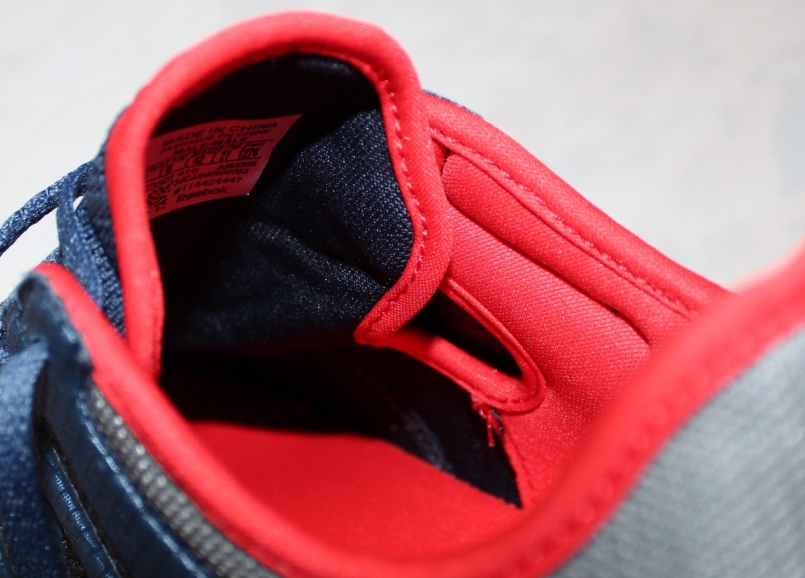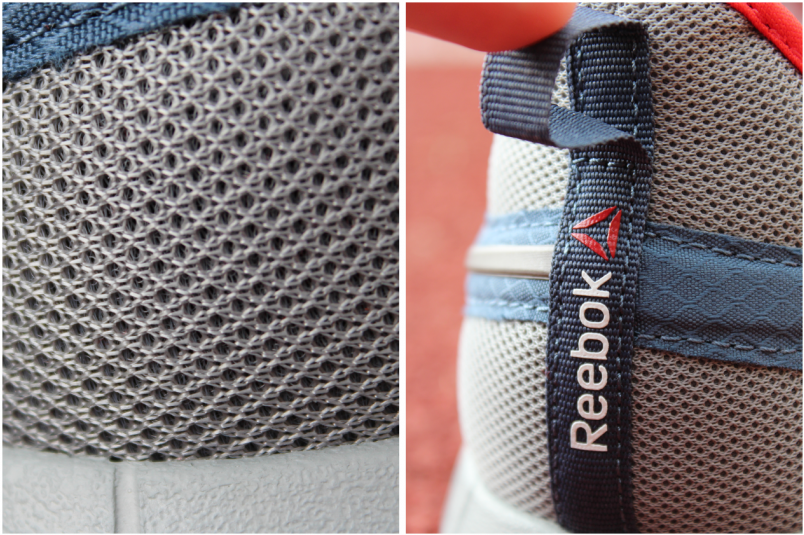 特寫鞋後跟護套,可以發現其結構相當縝密,多層次的編織法亦強化了足跟的保護。此外,Reebok 於鞋後車縫了一條拉環,拉環上印有品牌膠字與 LOGO 膠字,其功能性是與結尾的側向支撐片做呼應,讓跑者訓練後能提著跑鞋回家。