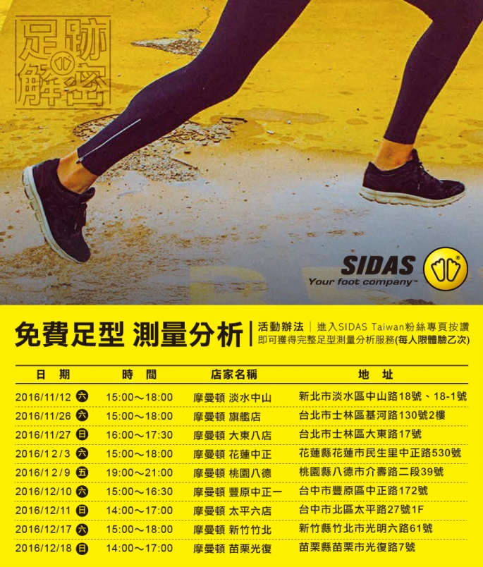SIDAS 全台巡迴足測場次一覽(圖片來源:SIDAS)