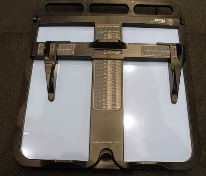每位參與者開始靜態足測前,SIDAS 的品牌足測人員很貼心地用酒精將用具都消毒過一次。靜態足測時,參與者先是坐在椅子上,雙腳足跟緊靠板子下緣並將整個腳掌踩上去,接著慢慢站起身,採取平時的站姿,除了表現比較自然之外,對於測試的結果也相對準確。