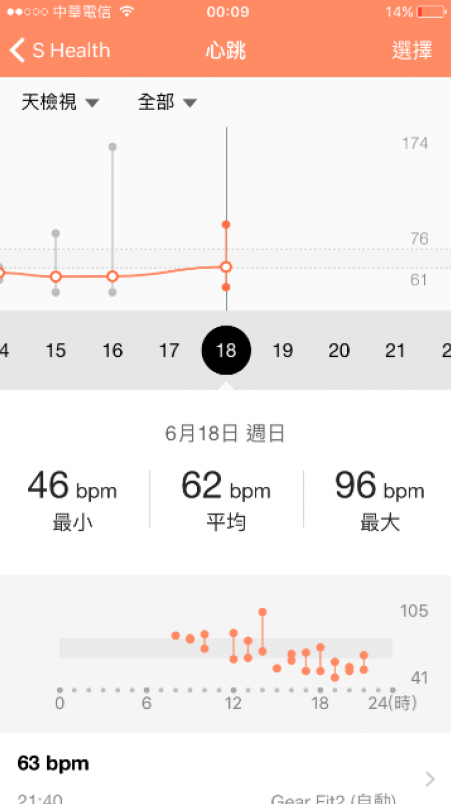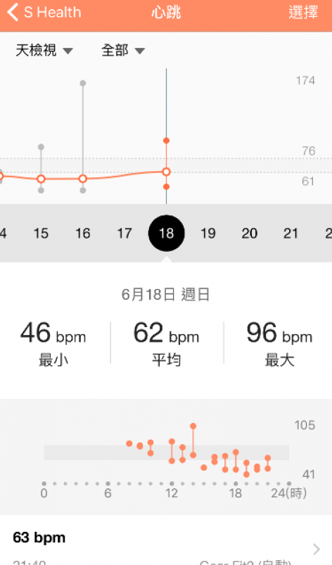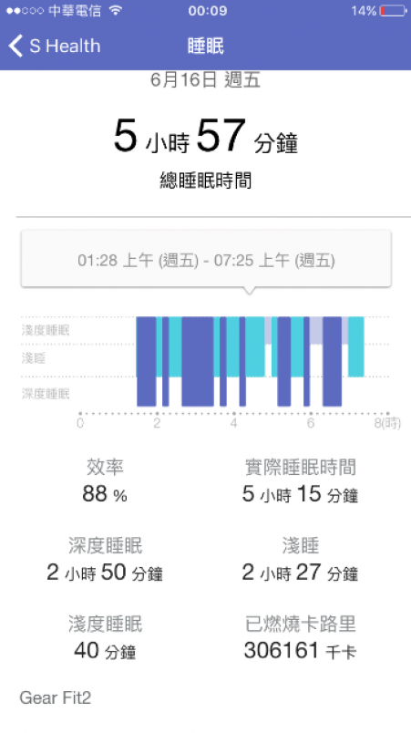 睡眠時間紀錄的功能我非常的喜歡,在之前也不知每次的睡眠是否有達到休息的效能,透過 Gear Fit2,可分析出自己睡眠的「效率」。心率的追蹤更是主打功能,透過一日的紀錄,可了解自己的靜止心率,平均心率或是運動的最大心率值是多少,並透過分析與觀察,從中了解身體的狀況。