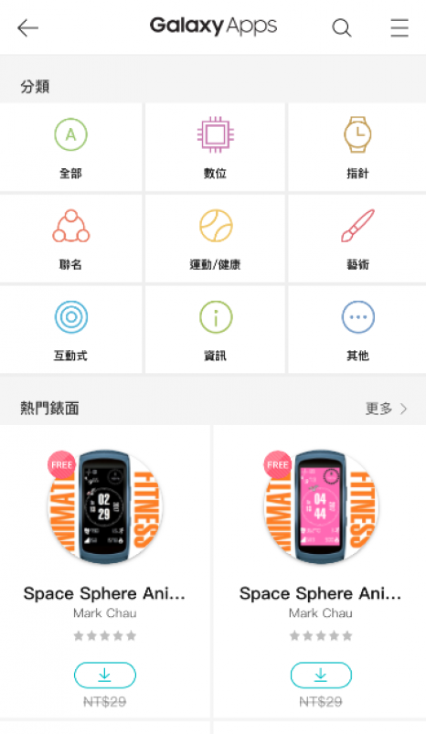 Gear APP 除了可設定手環一些細節控制項目外,最讓人吸引的功能還是在於可購買最新的錶面設計,或者是自己喜愛的風格,不用拘泥在單一的錶面,這可是很吸引人的!!