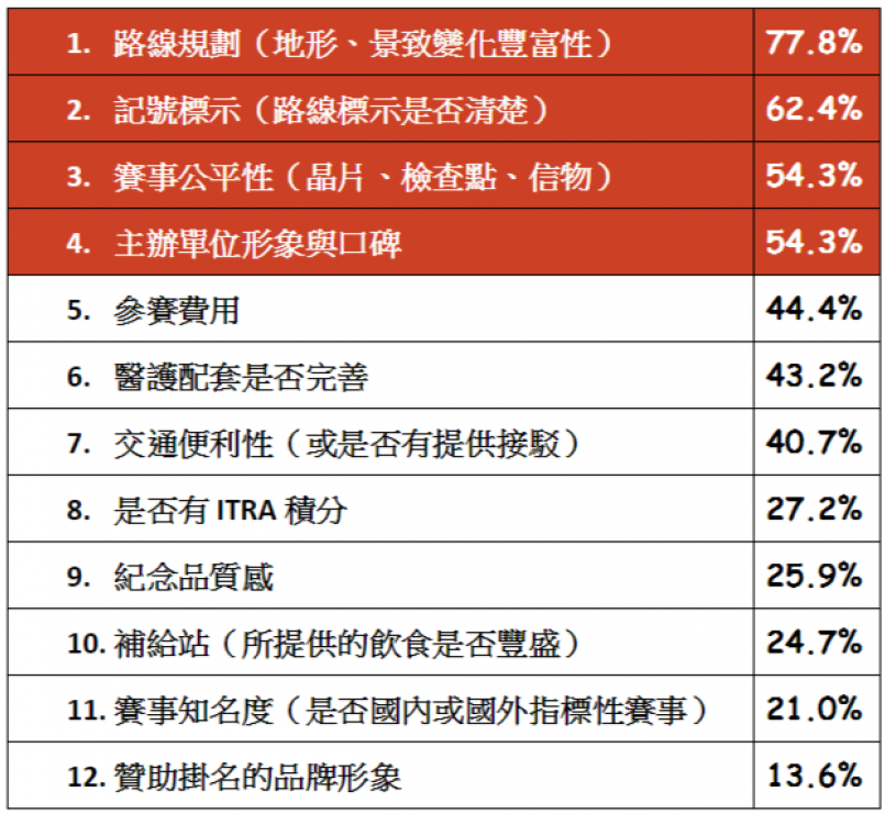 至於主辦單位經常強調的補給站與紀念品,倒是出乎意外的落在偏低的比例。兩項在細分上的差別是 - 紀念品質感比在補給站吃得好不好更重要。補給只要足夠就好,至於是否豐盛?越野選手們似乎沒那麼看重,這或許跟資深的越野跑者會養成自揹簡易行動糧的習慣有關。
