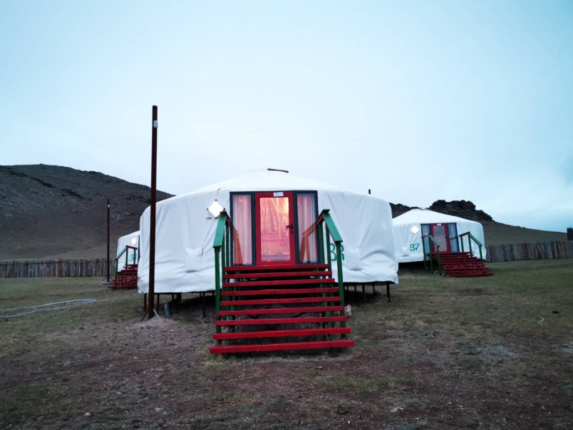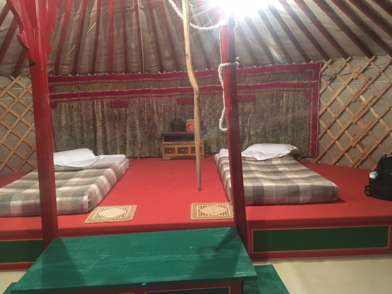 蒙古包是一個大帳篷,用柱子撐住,內妝洋溢著蒙古風味;設備則是「跟上時代的」,中間是暖爐,還有衛浴設備呢!