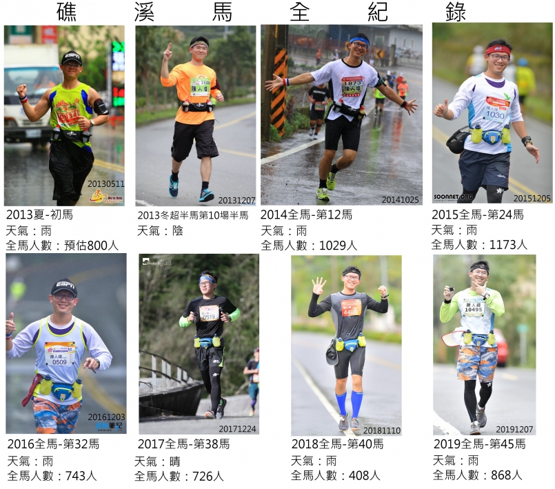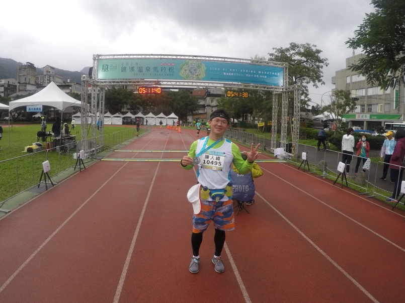 從26公里到32公里為緩上坡路段,和跑友聊天後,才覺得速度太慢,努力加快步伐走到歷屆往櫻花園園的點,今年改為下山,可以全力衝刺,內心有些許的失望,漂亮的風景看不到,下山路線反不感到疲憊,也許想讓爺爺奶奶及爸媽看帥氣的模樣,終點前1公里處,先看到奶奶坐在門前等待,大喊一聲。隔幾公尺請媽媽幫我拍照,因而停留一段時間,最後於礁溪國小完成個人的第45馬,05時38分,慢上屆5分鐘,連8次參與,7次全馬1次超半馬。
