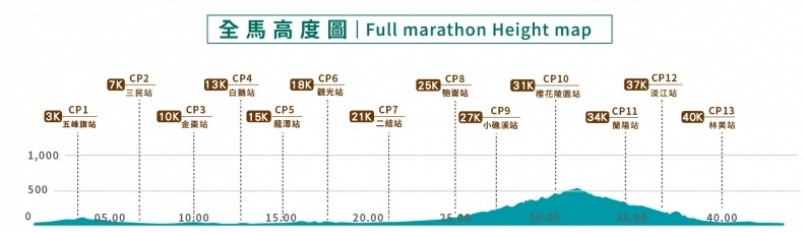 起跑後一開始微上坡 3 公里,之後就一路平緩,直到第 25 公里起,便要進入本場賽事大魔王-櫻花陵園路線,努力爬升至第 32 公里到達最高處,抵達標高將近 550 m 之最高點;最後下坡長達5公里,陡下坡容易讓已經疲累的跑者更加難熬,全馬5小時完賽,均速將會是7'06/km(含補給時間),分段配速策略如下:
