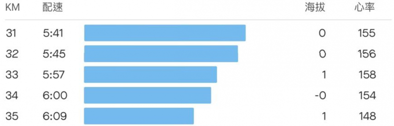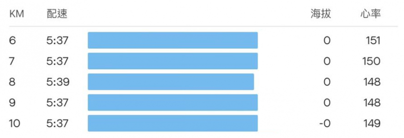 前3K因為一直抓不太準錶頭配速跟實際配速的誤差,所以比預期略快一點,後面就慢慢穩定下來,恢復目標配速5:35-5:40的熱身配速。
