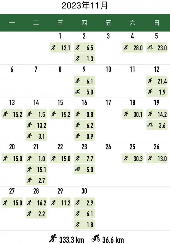 所以雖然七月開始堆跑量,但基本上都是輕鬆跑跟LSD,沒什麼強度質量課表。直到十一月才直接銜接巔峰期的質量課表。