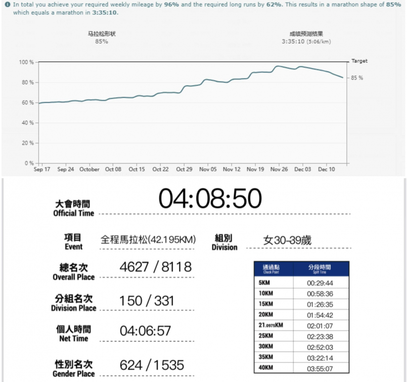 偏偏在十一月初氣喘發作,這一休就將近是一個禮拜,巔峰期課表吃沒幾次就要準備減量了。所以對於能不能破四實在是沒把握,畢竟跟騎車比起來我真的不是跑步的料,每一次些微進步的成績都是要很努力很努力一點一滴堆積起來的,在這個初馬就破四、330、破3的年代裡,大家可能會覺得我練這麼多到底都為了什麼?