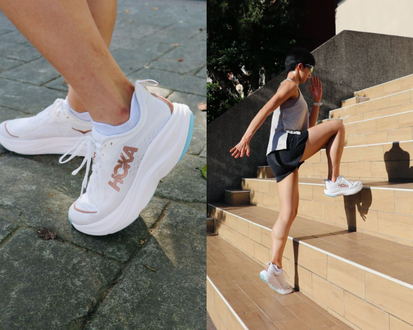 HOKA SKYFLOW 白色鞋面搭配玫瑰金,運動與休閒穿搭和諧(照片來源:Teresa Pai)