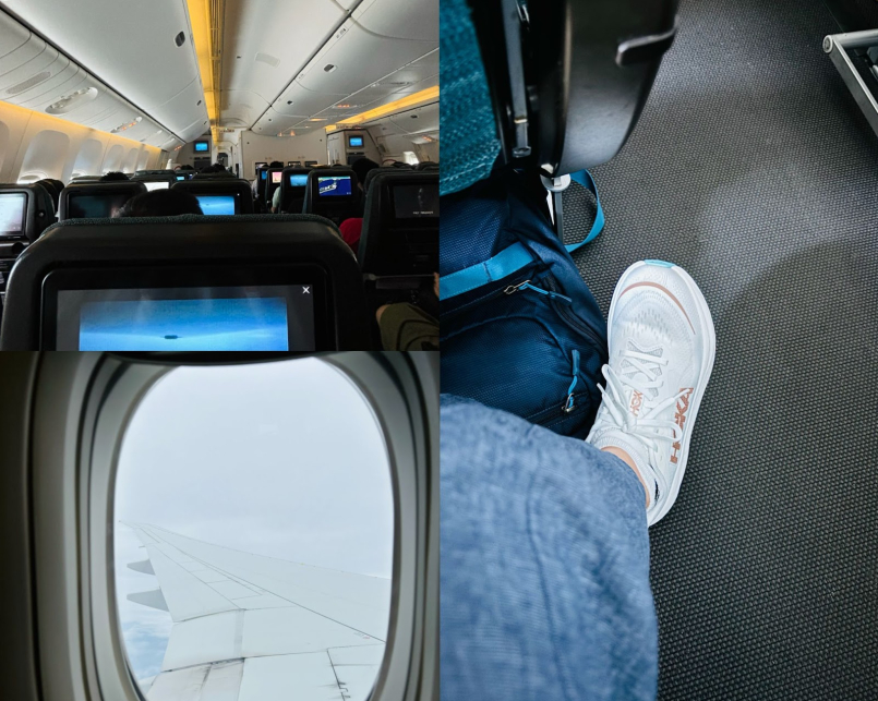 出國跑旅的舒適選擇,穿著HOKA SKYFLOW搭乘飛機時很舒適!(照片來源:Teresa Pai)